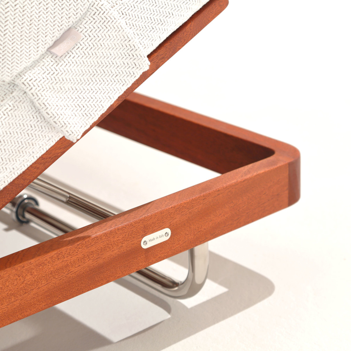 The rectangular, slimline mahogany hardwood frame is completely adjustable and sits on a stainless steel 316 base, which will remain corrosion-free. Integrated wheels are in-keeping with its clean lines and provide easy maneuverability, while our range of exclusive outdoor fabrics encase its sumptuous mattress and pillow for complete peace of mind against the elements. The edges of the frame are smoothed over - a testament to the thought and detail that go into Seóra’s luxury outdoor furniture.