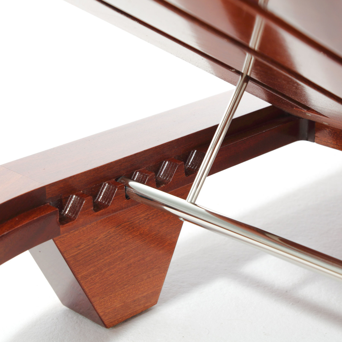 A curved wide-body frame in mahogany hardwood provides ample room to stretch out and relax while a dry-feel foam mattress and pillow in one of our exclusive outdoor fabrics create an ultra-comforting feel. The design goes a step further with stackable wooden leg supports, clip-on system for the cushions, adjustable backrest and a soft and soothing sensation thanks to the carefully considered position of the central beams.