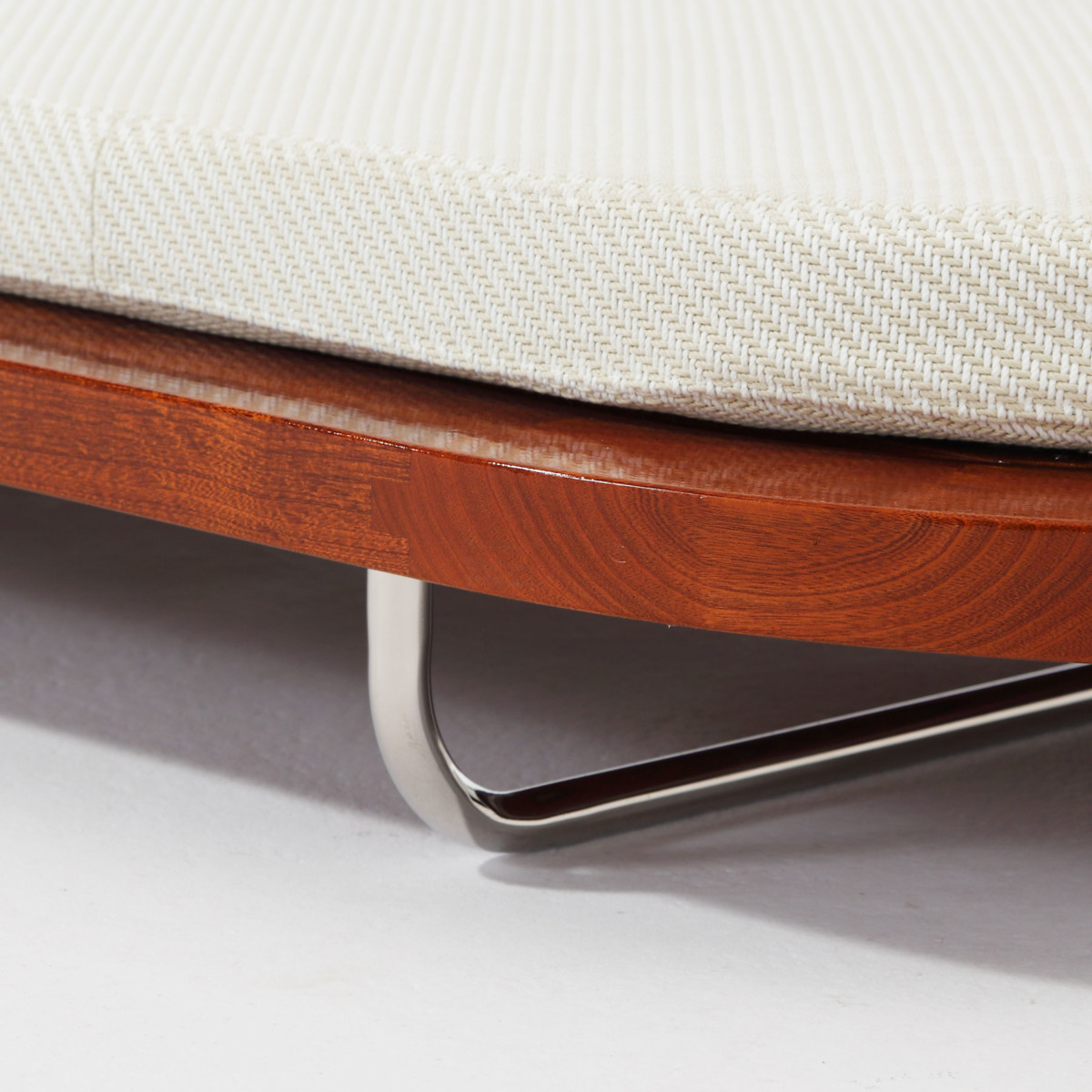 Its curved wide-body frame in mahogany hardwood puts it right at home beside the flowing lines of infinity pools. Discrete, integrated 316 stainless steel wheels mean it moves around smoothly, while the careful positioning of the central beams guarantees a soft and soothing sensation. Add to that a dry-feel foam mattress and pillow in a choice of exclusive fabrics, which are non-slip thanks to the clip-on system, for ultimate relaxation.